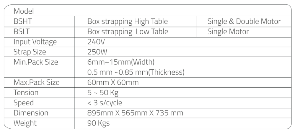 Designed for secondary cartons, containers, and wooden boxes, these machines deliver reliable strapping with PP / PE straps. Available in two models – High Table and Low Table – to suit diverse operational needs.