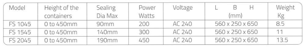 Designed for sealing cups, cans, bottles, containers, and trays. Offers adjustable height and heat control.